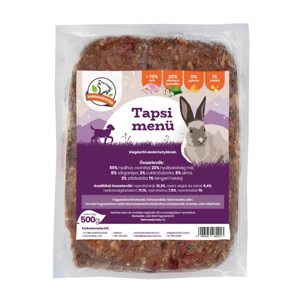BARF menu zo 100 % králika: obsahuje v ideálnom pomere králičie mäso, králičie mäso s kosťou, vnútornosti, zeleninu, ovocie a sezónny šalát.